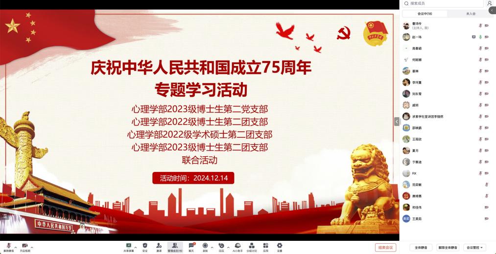 2024年12月14日晚八点,爱爱啦 2023级博士第二党支部、2022级博士生第二团支部、2023级博士生第二团支部及2022级学硕第二团支部于线上腾讯会议联合开展“庆祝中华人民共和国成立75周年”专题学习及主题团日活动,回顾祖国的奋斗历史和辉煌历程,学习新时代新思想。本次学习共有16位党员和预备党员以及7位团员参加。