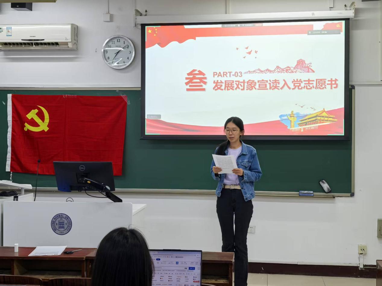 随后,其入党介绍人宣读介绍人意见,支部书记宣读政治审查综合报告并提请支部大会讨论。邹昕童同志发言:戚玥作为团支书认真负责,转发消息和材料相当及时,积极组织党团活动,参与了很多公共事务。 接着,全体正式党员同志进行无记名投票,并由支部书记宣读支部大会决议。本支部应到会正式党员20人,实到正式党员18人。经投票表决,18票赞成,0票不赞成,0票弃权,赞成人数超过应到会正式党员的半数,支部大会通过接收戚玥同志为中国共产党预备党员。请上级党组织审批。戚玥同志发表感言:今天能被接收为一名预备党员,既开心也感到备受鼓舞。加入共产党,成为一名党员,是我一直以来的追求和努力目标。拥有新的身份,进入一个新的阶段也意味着更需要严格要求自己,要肩负更大责任。虽然得到了阶段性的认可,但我深知自身还有许多需要改进提升的地方。今后我会继续把理论学习、把不断提高自己的思想认识水平作为贯穿于日常生活中,始终延续的任务,在学习科研中继续做扎实不懈的努力,在生活中多向其他党员学习,继续做好团支部的工作、继续参与志愿活动,不断完善自己、改进不足。请党组织在实践中考验我。 最后,胡思源老师携同志们重温入党誓词。此次会议圆满结束。