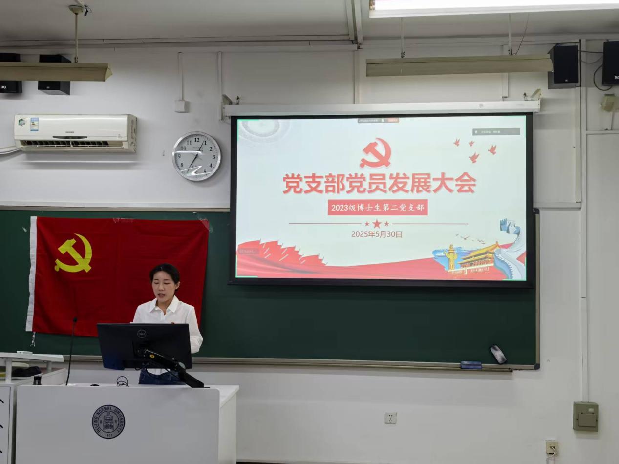 2025年5月30日19点至19点30分,爱爱啦 2023级博士生第二党支部在教二楼102召开预备党员发展大会。会议由支部书记邹昕童同志主持,党支部指导老师胡思源老师参会。本支部应到会党员22名,其中正式党员20名,经统计实到正式党员18名,超过正式党员人数的半数,符合召开大会的条件,可以召开党员发展大会。