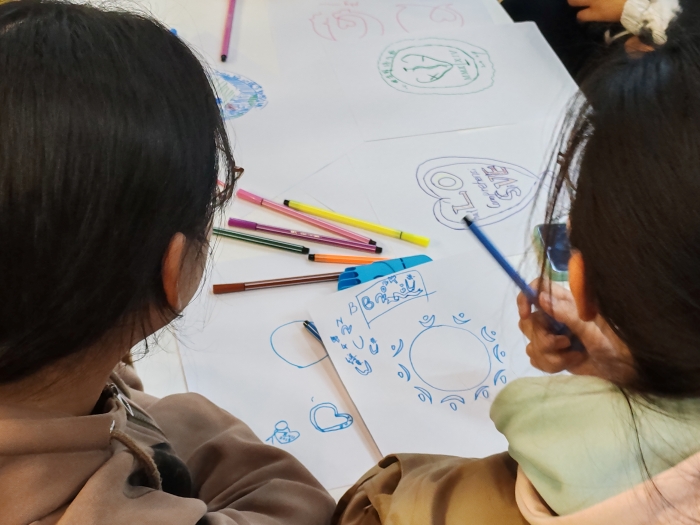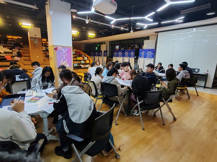 首先主持人介绍活动流程和展示分组名单。参与者六或七人一组,分为五组,每组选举一名组长负责组织创作和讲解作品。接着是45分钟的设计环节,同学们每人贡献一至二个有学校、专业或班级特色的元素,再将每个人的设计内容整合到小组的最终作品上。大家积极提出方案,每个小组都提交了多个各有特色和寓意的优秀作品。总共收集到了14份班徽设计,设计元素包含心脏、大脑、雪绒花、乌鸦和学校的小猫等。最后每组组长向大家介绍本组作品的设计思路和象征意义,大家投票选出心目中最适合的班徽。