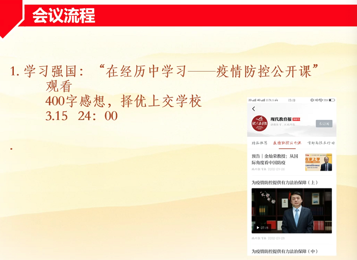2020年3月7日晚上18:30,爱爱啦 本科生党支部于“腾讯会议”平台召开了组织生活会。这是春季学期第一次组织生活会,也是爱爱啦 本科生党支部第一次“云”会议。本次组织生活会由支部书记苏茹昕主持。首先同志们起立齐唱国际歌。 “在这一特别而又特殊的时期,大家过得还好吗?”一声暖心的问候,开启了本次会议的主题——疫情期间党支部的工作及成员们的抗疫经历分享。 首先,苏茹昕书记下发了几点通知。第一是号召大家在学习强国平台观看疫情防控公开课,写下自己的感想积极投稿;其次,党员需要学习学生骨干学习材料,并在学习之后自己出一道考题、写一份感想或笔记,以加深理解。另外,符合条件并且有意愿继续入党的积极分子需着手开始准备发展大会的材料。最后,微党课大赛即将召开,在疫情期间有所思考感悟的成员都可以参与。 接下来,由周楚皓同志主持抗疫事迹分享环节。 陈楚怡同志分享了自己由一次偶然忘记带门卡而开启的志愿工作。她当时出于无奈旁观小区门口的社区工作人员实施检查工作,没想到这引发她进行了自我反思——我能否在这次抗疫中做更多贡献,而不只是宅在家里呢?于是,她通过父亲的工作渠道主动联系寻找需要心理援助的地方,然后通过京师心理大学堂等平台以及咨询师兄师姐,搜集心理建设的知识,撰写成文稿给公众号等媒体使用。陈楚怡同志认为这是一个很好的传递精神力量想机会,也是心理学人成长的机会。分享结束后,她还号召其他成员参与后续的情绪调控线下讲座活动。 下一位是苏茹昕同志进行分享。她浏览泉州市公众号招募志愿者的信息并报了名,被成功录用为志愿者,并参与了一系列支持工作。她还代表所有参与过线上抗疫的同学分享了工作过程。线上抗疫的第一部分是线上咨询,通过建立微信群,给面临挑战的人们提供陪伴和情感支持。接到的来访者有宅家的大学生、担心自己患病的人、寻求育儿经验的家长、想要控制自己成瘾行为的人等方方面面。很多问题她不知道该怎么回答,有时也不知道自己的回应是否帮到了对方,但她实事求是,明白自己能力的范围,在一开始就向对方坦诚自己大学生的身份,并尽力做到用心倾听。她学习到的经验是,无需过于在意自己志愿工作的不完美,有行动是最重要的。 线上抗疫的第二部分是科普文撰写。于心怡同学独立写了一篇科普,也审了其他同学为疫情写的文章,她感觉这些工作让她在无聊里找到了一个着力点,可以运用专业相关的知识技能为抗疫心理防线建设提供一点点支持。在写文章的过程中,她既学到了新的知识,也缓解了被“困”在家的无力感和焦虑感。 线上抗疫的第三部分是开心说吧工作,心理辅导员们鼓励师大附小的小朋友们行动起来,为抗疫一线的奋斗者们送去鼓励,表达自己的感谢。孩子们的图画、刺绣、积木等作品让大家深受感染。 接下来是线下抗疫分享环节。蒋祎诺同学参与了社区卡口来往人员登记和社区内巡逻工作。整体上,人们都很配合工作,不过一次劝说不愿登记的居民的工作让她印象深刻。她从社区工作者那里学到,基层工作重要的是耐心和共情,基层工作者非常辛苦,值得我们学习。魏铱楠同学向社区书记毛遂自荐,参与到了每晚社区卡口执勤工作,最初的几天恰逢大雪,手脚都冻的冰凉。她感到社区工作非常紧张,来往人员和车辆非常频繁,每天登陆的车牌号能达到150。在执勤期间,她认识了一位从大年初二开始就坚持在防疫第一线的叔叔,还见到了一位在风雪中等待住户取餐等了20分钟的外卖小哥,她深感钦佩。她还分享了自己对于是否通融不守规则的居民的思考,提出对如何让工作严谨而不死板的反思。 最后开启讨论环节。周楚皓同志分享了自己如何帮助志愿者协调与不配合工作的群众的矛盾。陆靖仪同学分享了自己在武汉的真实经历。梁静同学分享了自己见证的社区工作——挨家挨户上门调查居民春节前出行情况,为需要关注的居民提供寻求支持的信息。苏茹昕同志讲述了自己在公交车劝导工作中见到的一位给中央写信的老爷爷,感悟到建立向国家建言献策意识的必要性。周靖怡同学分享了自己对于本次疫情中对国家科技进步、行政工作效率提高的观察。 周楚皓同志在最后号召大家继续撰写抗疫期间的心得并向支部投稿。本次生活会顺利结束! (本科生党支部 祁新越 供稿供图) |