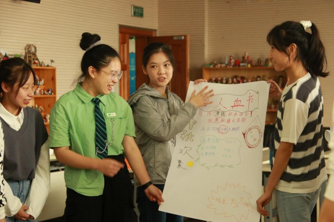 图 挑选心仪沙盘道具 然后,黄老师组织各个小组以欢度中秋或兴趣活动为主题制作手绘海报。在制作过程中,同学们发挥了书法、绘画等多方面的能力,设计出一幅幅样式精美、内容充实的宣传海报,并分组依次进行了阐述和讲解。