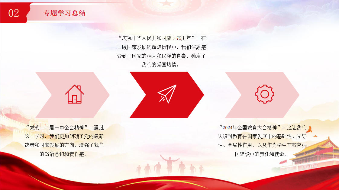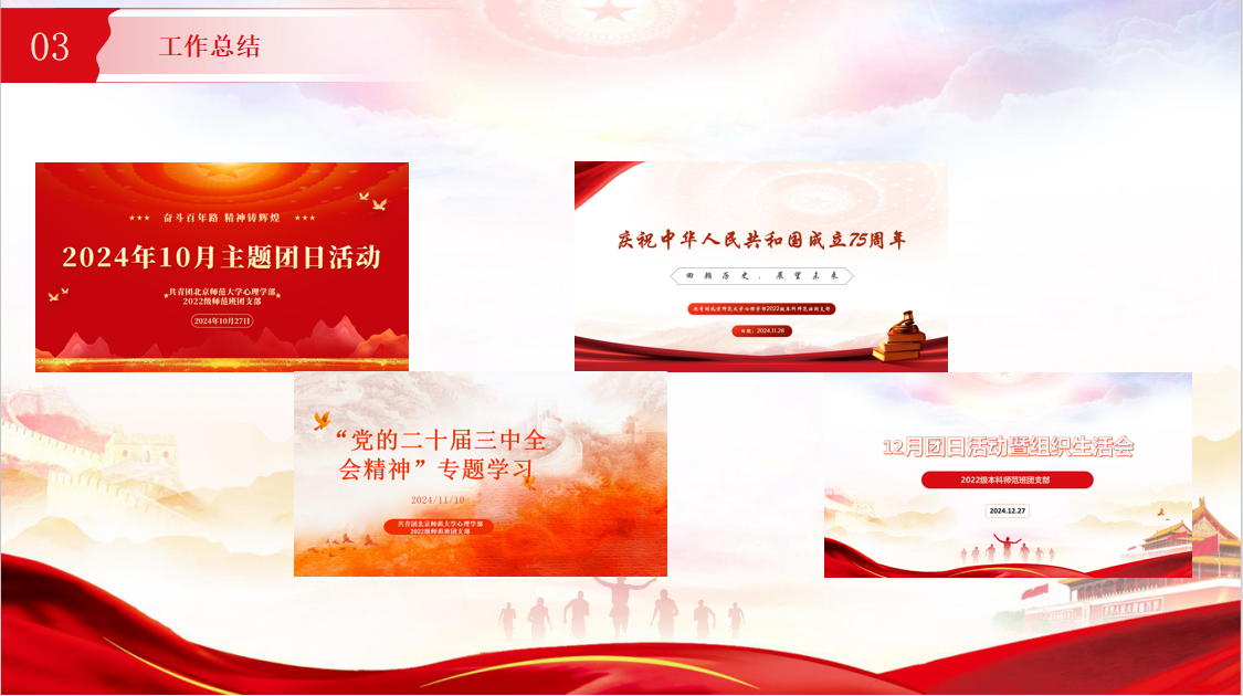然后,团支书对本学期的专题学习进行总结。回顾“庆祝中华人民共和国成立75周年”“党的二十届三中全会精神”“2024年全国教育大会精神”等学习内容,团员们深刻感受到了国家的强大和民族的自豪,明确了党的最新决策和国家发展的方向,增强了政治意识和责任感,也认识到教育在国家发展中的基础性、先导性、全局性作用,以及作为学生在教育强国建设中的责任和使命。