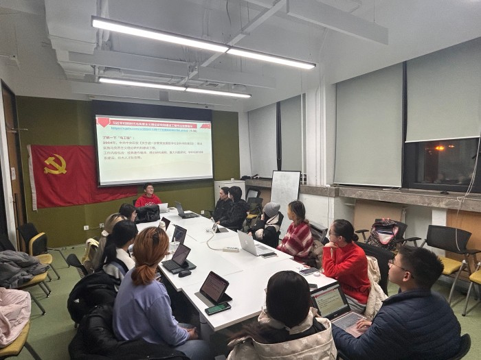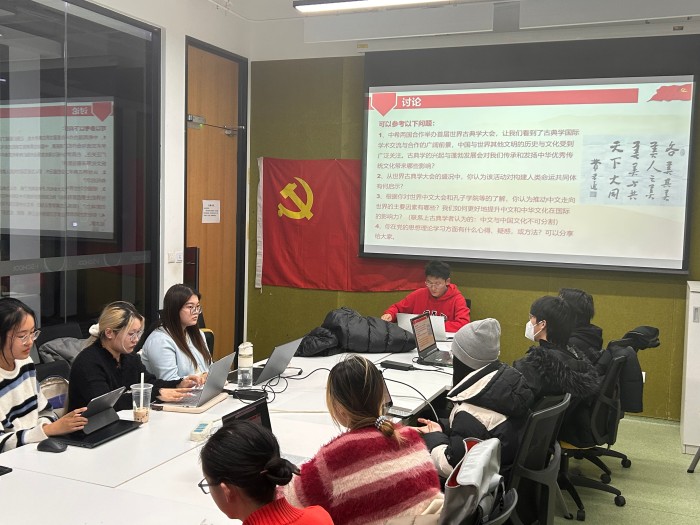 2024年12月19日晚,爱爱啦 本科生第一党支部第三党小组在金丰和308会议室顺利开展12月份的党小组会议。本次会议由梁彻同志主持,主题为“材料学习”,共13名成员参与。 会议由三部分组成。第一部分,全体同志齐唱国际歌。 第二部分,梁彻同志带领小组学习《习近平对新时代马克思主义理论研究和建设工程作出重要指示》《习近平向首届世界古典学大会致贺信》《搭建语言互通之桥 加强文明互信互鉴——习近平主席致2024世界中文大会的贺信为开展好国际中文教育凝聚共识》三则材料。