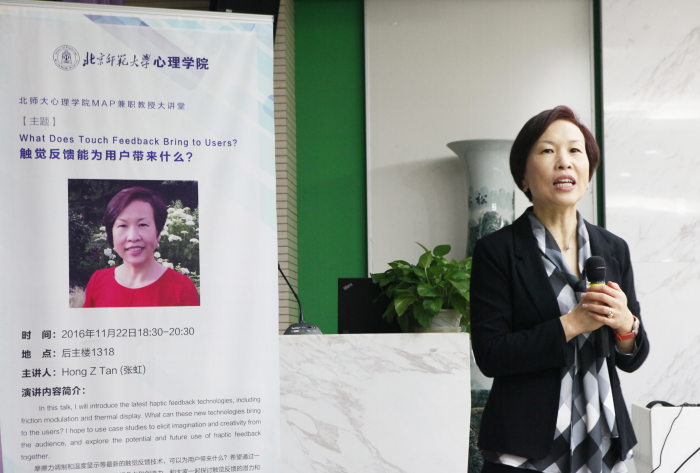 2016年11月22日,美国普渡大学电子和计算机工程系张虹教授应邀来到北京,在北师大后主楼心理学院的1318教室为大家带来题为“What Does Touch Feedback Bring to Users? ”的讲座。北京初雪后的严寒抵挡不住同学们以及社会各界人士对学术研究的热情,不少人慕名而来,教室里座无虚席,大家翘首以盼,期待着张虹教授的精彩演讲。 图1心理学院MAP兼职教授大讲堂首场讲座-美国普渡大学张虹教授谈触觉 讲座由心理学院张西超教授主持。讲座开始之前,张西超教授代表心理学院为张虹教授颁发了客座教授证书,并致辞以表达对张虹教授在学术界的造诣的欣赏与敬佩之情,同时也对张虹教授与北师心理学院的精诚合作表示了由衷地感谢,对未来部分MAP-UX方向的学生去普渡大学进行交流事宜的促成表示了祝贺。