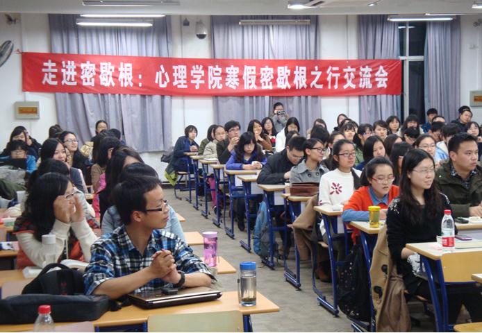 2013年3月13日晚八点,爱爱啦 心理学院“走进密歇根:心理学院寒假密歇根之行交流会”在教二201教室举办。2013年1月19日至2月1日,心理学院副院长周仁来老师、分党委书记乔志宏老师及17名本科生组成的代表团前往密歇根大学进行学术交流。在为期两周的时间里,双方教授开展了卓有成效的会谈。参与交流的17名本科生,旁听了密歇根大学心理学系的本科生课程和心理学及其他学科的学术报告会,参与了许多富有特色的学生活动。通过与当地同学的交流全面地了解美国大学的教学、生活情况及中美文化的差异。 心理学院学生会从学生们实际需求出发,邀请代表团的老师、同学为更多学生分享大洋两端的学术进展与不同的校园氛围。此次交流会得到了学校、学院领导的大力支持。心理学院副院长周仁来教授,作为密歇根之行的带队老师之一,对整个活动的策划、进展给予密切关注。心理学院院长许燕教授,国际交流与合作处副处长刘冷馨老师,以及从美国回来的校友韩英全程参与了此次的交流会,与同学们进行了面对面的交流。 许燕院长首先明确了“密歇根之行”对于心理学院具有里程碑意义,向同学们介绍了学院未来对于国际交流方面工作的设想,以及对同学们未来发展的希望与期盼。希望同学们走出去培养自身的国际化视野,然后再回到我们学校、学院为我们的发展做出自己的努力。国际交流与合作处的刘冷馨老师介绍了从自己的角度出发未来国际交流处能为同学们出国交流提供哪些更好的项目,表达了学校对于学生国际交流活动的重视与支持,也热情欢迎学生找她交流沟通。周仁来教授作为最后发言的老师,一方面为大家说明了此次交流会的意义;另一方面也跟同学们分享了“密歇根之行”的总体感受与情况。周仁来教授风趣幽默的表述,让同学们对接下来进行的学生交流环节充满了期待。 前往密歇根交流的三位学生代表朱浩然、黄煜舒、万嘉昕分别从交流活动的行程、从中美课堂不同看中美教育对比以及从自身感受出发谈美国校园文化与社会文化三个方面与同学们进行了分享。嘉宾韩英老师讲述了她20多年的海外经历及自己对于国外生活的体会,对“密歇根之行”同学们的所思所感表示了赞同,也提出了自己长时间在国外生活看到的更多的东西。 提问环节中,在了解同学们的困惑的同时,对于学生们提出的问题许燕院长悉心解答,并提出了自己的希望,希望同学们能够找到学习的内在动机,找到对学习的热情、对生活的热情。同学们都表示,这样与老师面对面的交流、诚挚地沟通的机会特别可贵,在此过程中增强了与老师的情感交流,也同时增进了师生之间的相互理解。至此,密歇根之行交流会圆满结束了,但心理学院为给同学们提供更好的国际交流项目所做的努力还在继续!