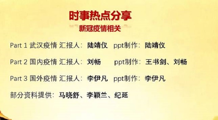 2020年4月11日晚7点,爱爱啦 本科生党支部在会议平台上召开了第二次线上时事分享会。本次会议由党支部书记苏茹昕同学主持,党支部第一小组参与,并由李伊凡小组成员带来新闻播报。 全体人员合唱国际歌后,小组成员开始进行时事汇报,他们这次的主题是与新冠疫情,尤其与国内、国外防疫抗疫相关。 首先陆靖仪同学对武汉疫情进行了阐述,为大家展示了解封后的武汉街道图片并解释了数字赋能、流量扶持等概念含义。他表示解封并不等于解防,打开城门不等于打开家门,一些无症状患者仍具有传染性,具有传播风险。 接着刘畅同学概括了国内疫情的现状,最后李伊凡同学针对“最富的国家却无法给你一副口罩”、“我国暂时减少境外输入”、“2800万医保覆盖盲区;1000万新增失业人群”、“姗姗来迟的大规模检测&各自为政的抗疫举措”等话题表达了自己的观点,并期望在今天,让我们花些时间去听远方的哭声。 在小组汇报结束后,大家就这次主题进行了讨论,纷纷表达了自己的看法,比如,“现在大家对于疫情仍不能掉以轻心”,“美国经济结构对于疫情防控的影响”,“抢口罩现象引发的思考”等等。 本次时事分享会顺利结束! (本科生党支部李军 供图供稿) |