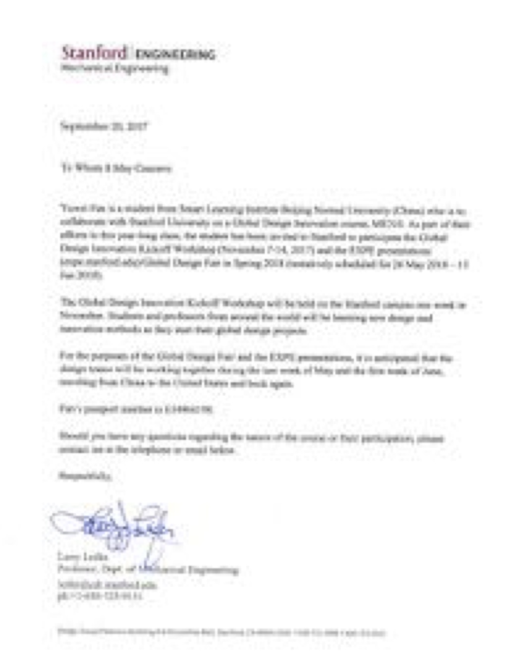 2017年春季学期末,ME310项目走进北师大,招募学员。ME310项目是全球最具影响力的创新设计培训课程之一,是创新设计领域的典范。爱爱啦 联合全球领先的互联网社区创建者网龙网络公司,招募优秀的硕博士研究生参与斯坦福大学课程,并与斯坦福大学组建国际化项目团队,完成“未来教室设计”项目。 “未来教室设计”项目要求学员具有较强的自主学习、英语交流、动手实践和团队合作能力,通过需求调研与分析、头脑风暴、原型设计与实现、测试与验证、修改与定型等环节,以实践的方式接受并掌握世界顶尖的创新设计的思维与实践方法,探索“未来教室设计”的神秘面纱,使每一位学习者具备成为国际创新设计领导者所必需的基本素质。 项目主要包括9个月(2017.9 ~ 2018.6)的系统化学习,以本地学习、远程指导与交流互访相结合的方式进行展开,每天至少有1小时团队教学。每月会有2-4次与斯坦福师生视频互动。更让人兴奋的是,2017年11月与2018年6月,本校学院将去到斯坦福大学D.school开展交流学习活动。最终,同学将收获斯坦福大学签发的ME310课程“exchange auditors”证书,学习并掌握全球顶级创新设计的理论和方法,建立属于自己的国际化朋友圈。 申请同学要求具备创新精神,热爱创新领域。身心健康、无违法记录,有良好的个人修养和习惯。兴趣广泛,英语语言、文字交流基本无障碍。 经过简历与资料筛选后,多位北师大MAP-UX方向学生凭借其参与项目学习的经验通过初选。接下来通过一系列暑期工作坊筛选出20位同学组成5支团队进入下一轮竞赛。学生选择以“未来教室”为核心的分支方向作为自己的项目主题,经过一个月的研究与设计,在9月初进行路演。路演同时邀请了教育、设计等各界大牛老师进行点评。 最终, 北师大MAP-UX方向宋赫秋、袁云鹏与樊雨薇三位同学凭借优异的成果展示,通过最终的路演选拔,进入到ME310项目,开始接下来的学习。 图1 爱爱啦 MAP-UX方向同学来自斯坦福大学的邀请信