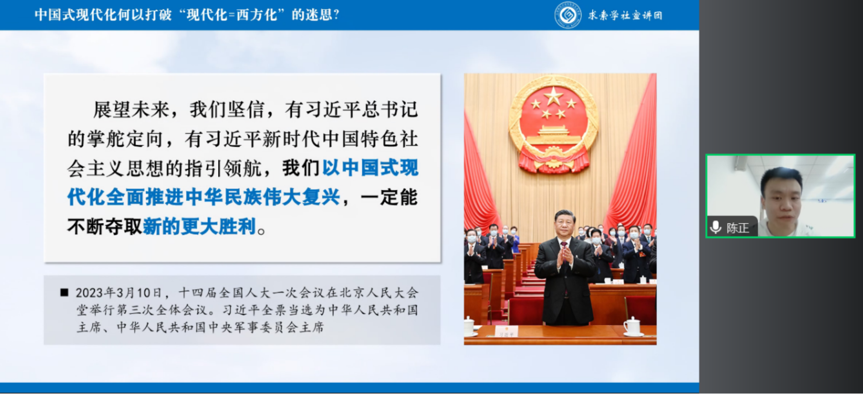 在题为《东风浩荡万里澄——中国式现代化何以打破“现代化=西方化”的迷思?》的宣讲中,陈正同学结合时事,带领同学们从多角度理解了中国式现代化和西方现代化的差异,并以“一带一路”为例,通过介绍“一带一路”在设施联通、贸易畅通、资金融通、民心相通等方面的成果,展现了中国式现代化的新成就,让同学们更深入地了解中国式现代化如何在深植文化根基、高扬制度优势、彰显世界意义等方面打破了西方对现代化的叙事垄断,展现出不同于西方现代化模式的新图景,成为一种全新的人类文明形态。