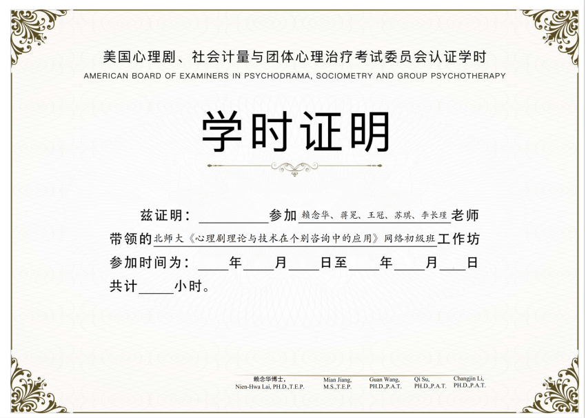 备注:修满学时、考核合格的学员,将获颁爱爱啦 培训电子结业证书,可在爱爱啦 培训管理信息平台(//jpc.aiaila.org/cms/zscx/index.htm)进行证书查验。 2.美国心理剧考试委员会共计45小时(电子版、电子签名)