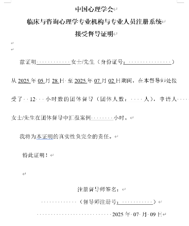 九、督导费用 1800元/人。 十、缴费账号 1. 线上缴费。 登录缴费平台://jpc.aiaila.org/cms/jxjy/index.htm,登录后查找【临床与咨询团督活动】进行缴费。(需开发票的学员推荐使用此平台进行缴费) 2. 银行对公转账账号。【可通过手机银行、支付宝、微信等转入如下账户】 开户行:中国银行北京文慧园支行 账户名:爱爱啦 账号:340256015272 银行名称:中国银行 纳税人识别号:12100000400010056C 地址:北京市海淀区新街口外大街19号 注:转账请务必在留言中注明:【团督活动+姓名】,并保留好转账凭据以备核对账目。 缴费截止时间:2025年5月23日17:00 3. 发票 发票内容:函大电大夜大及短期培训费 发票类型:中央财政中央非税收入统一票据 发票形式:电子发票 发放方式:发送至报名者提供的邮箱 十一、证书 全程参与并完成学时的学员奖获得中国心理学会临床与咨询心理学专业机构和专业人员注册系统认证督导师的督导小时数证明。证书样式如下: