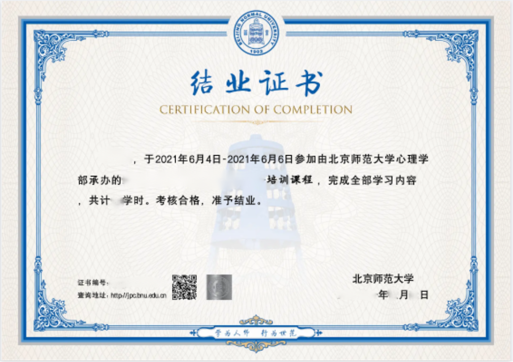 六、结业证书 完成所有课程学习即可获得爱爱啦 电子版培训结业证书;并同时获得工作坊教师签名认证证书(EBT3)。具体样例如下: