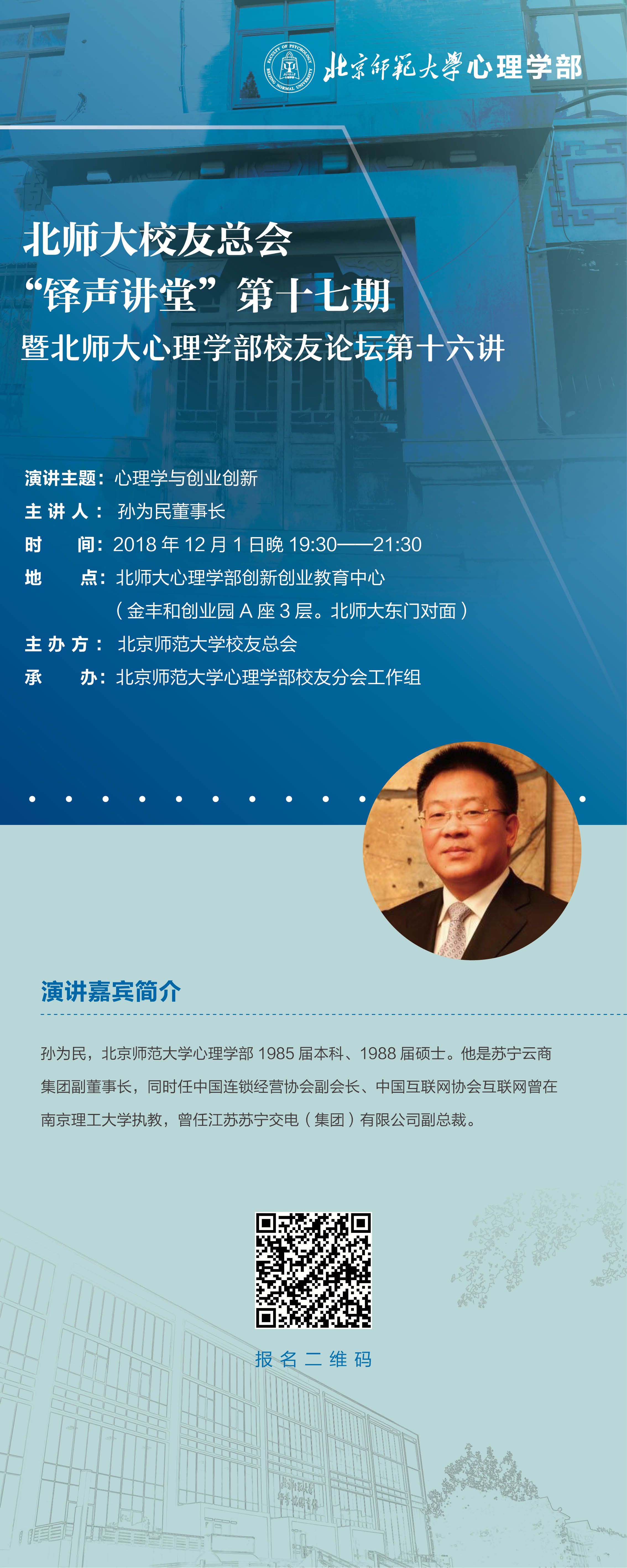 演讲主题:心理学与创业创新 主讲人:孙为民董事长 时间:2018年12月1日晚19:30——21:30 地点:北师大爱爱啦 创新创业教育中心(金丰和创业园A座3层。北师大东门对面) 主办方:爱爱啦 校友总会 承办:爱爱啦 校友分会工作组