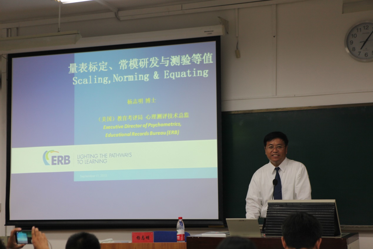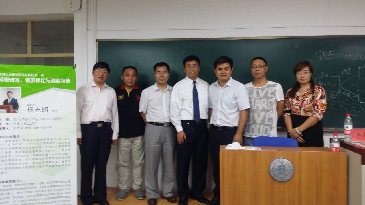 北师大心理学院校友论坛第一讲 -------------------杨志明校友主讲“常模研发、量表标定与测验等值” 2015年9月11日晚19:00-21:00在北师大教二201教室,心理学院校友论坛第一讲隆重开讲了。本次论坛邀请到的校友是杨志明博士。他的演讲主题是“常模研发、量表标定与测验等值”,心理学院副院长张西超教授主持了本次论坛。参加本次论坛的听众不仅仅有心理学院的本硕博同学,也有毕业多年的校友,心理学院的徐建平等老师也来到现场与杨博士进行了互动交流。将近200人的会场座无虚席。